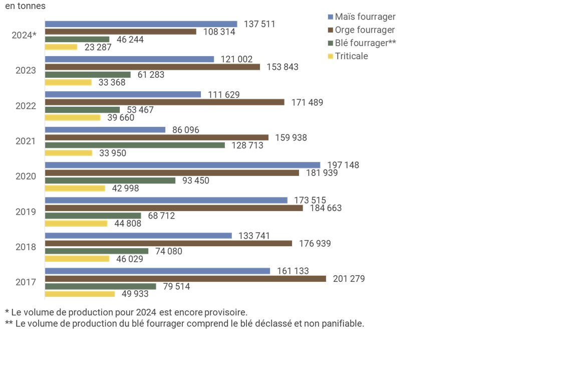 Céréales fourragères 2017-2024 : recul du volume de production, malgré des prix record en 2022