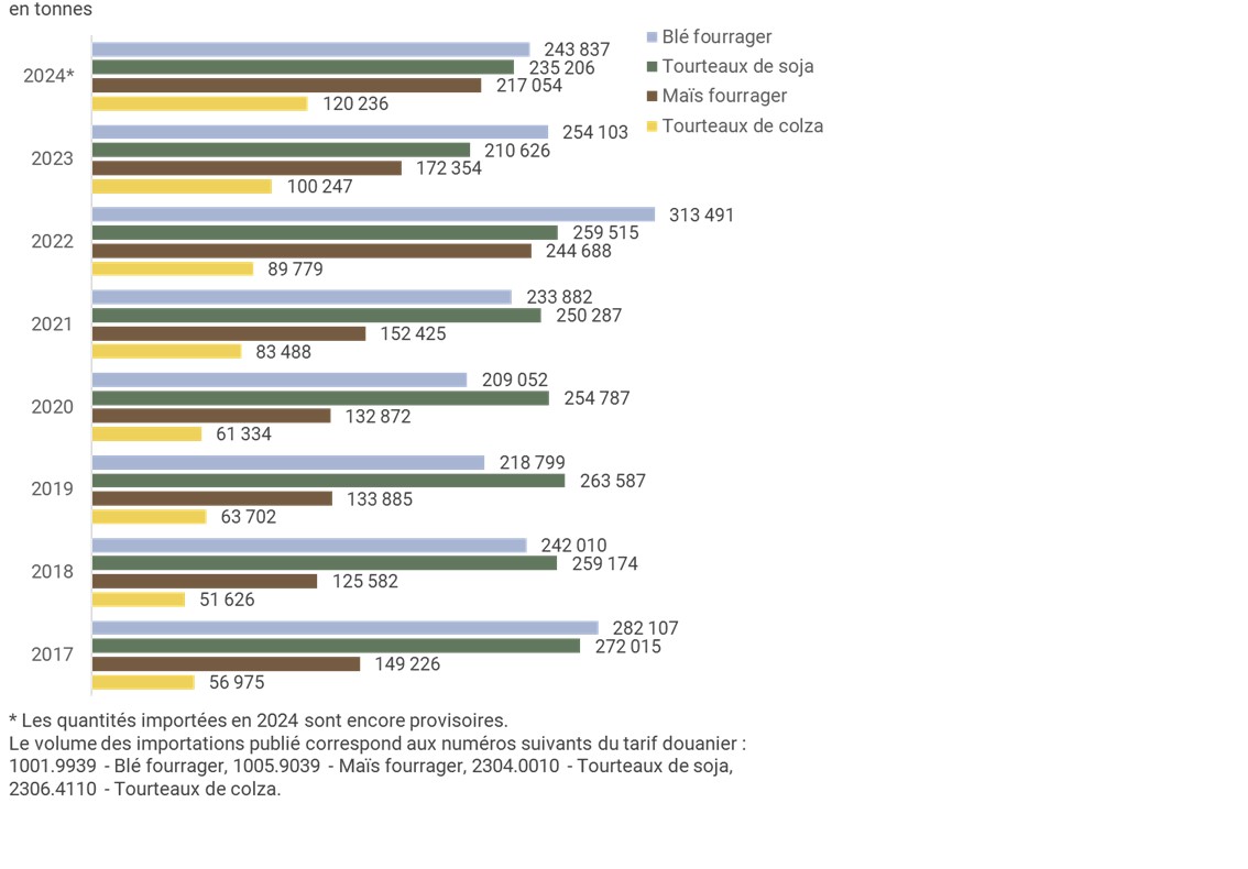 Les quantités importées de ces aliments fourragers ont augmenté globalement de 7 % entre 2017 et 2024. Les importations de tourteaux de colza (+111 %) et de maïs fourrager (+45 %) ont aussi fortement progressé au cours de cette période. Les importations de blé fourrager et de tourteaux de soja ont par contre reculé entre 2017 et 2024 (-14 %). En 2022, les importations d’aliments fourragers ont été exceptionnellement élevées, principalement en raison des faibles rendements nationaux en 2021. L’année suivante, la quantité importée des produits considérés est retombée à peu près au niveau de 2021. En 2024, les importations sont à nouveau légèrement reparties à la hausse.