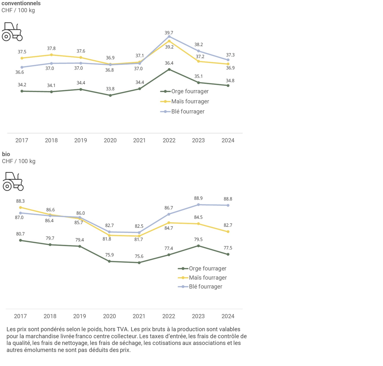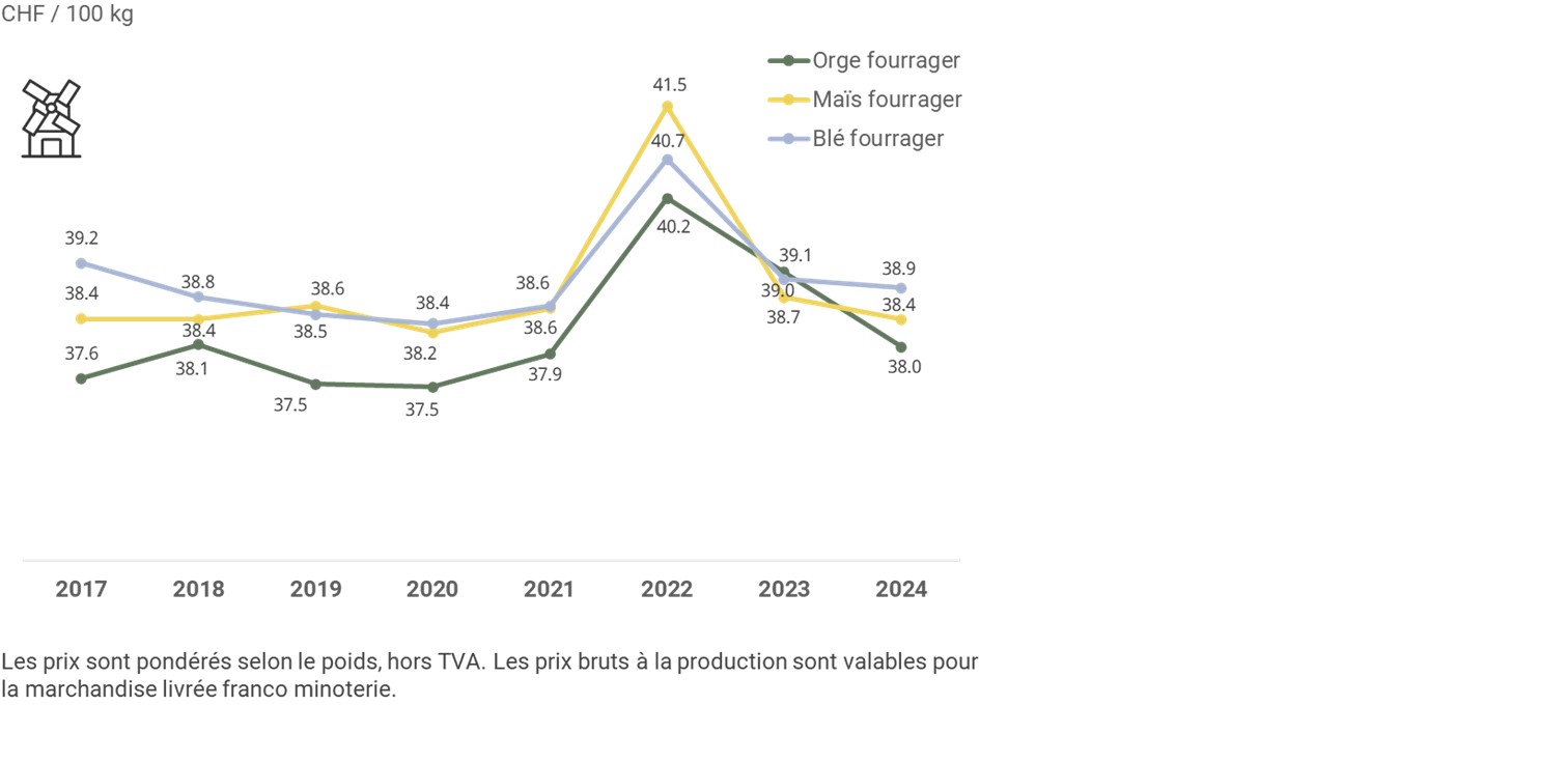 En 2022, les prix sur les marchés internationaux ont fortement augmenté en raison de la guerre en Ukraine. Ces hausses ne se répercutent sur le marché intérieur que sous une forme atténuée en raison du système de prix-seuils. Pour les céréales fourragères produites de manière conventionnelle, le niveau des prix est retombé depuis lors à peu près à celui de 2021. Les prix des principales céréales fourragères bio se sont rétablis plus timidement après 2022. En ce qui concerne le maïs fourrager bio et l’orge fourrager bio, le niveau de prix de 2021 a été à peu près atteint en 2024. Toutefois, le prix du blé fourrager bio en 2024 était encore nettement supérieur à celui d'avant 2022.