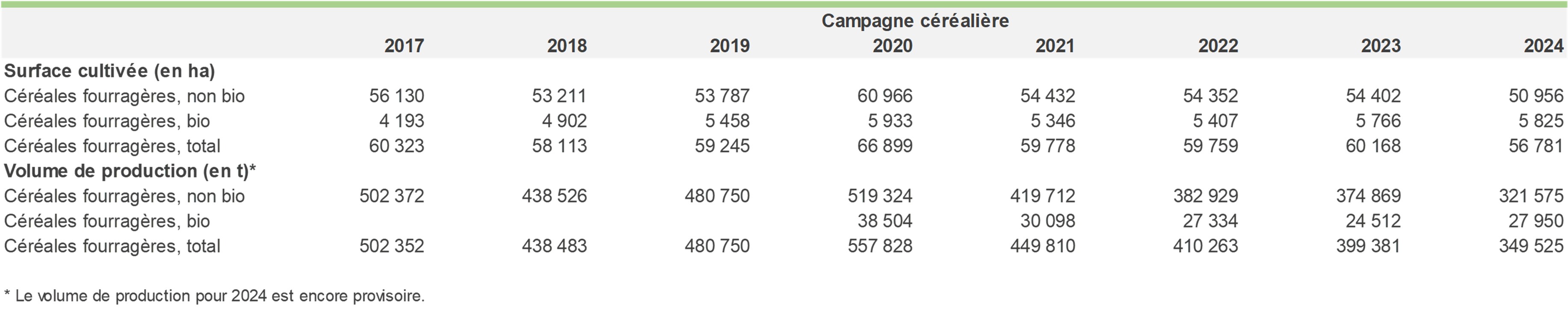 En 2024, 56 781 hectares (ha) de céréales fourragères ont été cultivées, à savoir 6 % de moins qu’en 2017. Si l’on étudie les surfaces cultivées selon le système de production, deux tendances se dessinent : la surface cultivée de céréales fourragères non bio a baissé de 9 % entre 2017 et 2024. Par contre, la surface cultivée de céréales fourragères bio a augmenté de 39 % entre 2017 et 2024. La surface cultivée fluctue fortement d’année en année (p. ex. en raison de l’assolement).⁵ C’est pourquoi la surface de céréales fourragères non bio n’a reculé que de 3 % entre 2017 et 2023.
